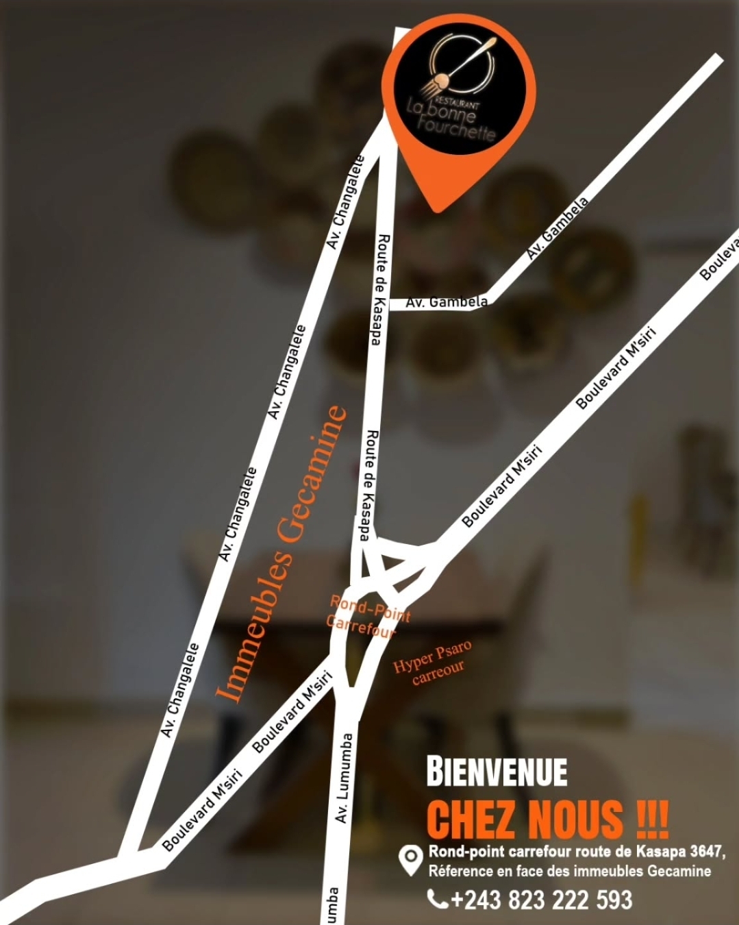 • Ouvert 7j/7 de 12h00 - 22h00 sur route de kasapa en face des immeubles gecamines non loin du rond-point carrefour